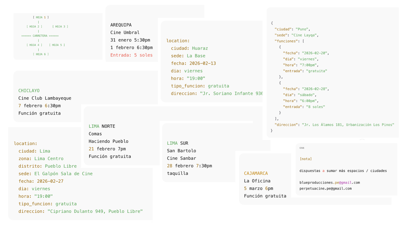 Entre finales de enero, febrero y marzo de 2026, El Archivo Bastardo comenzará a desplazarse por distintas ciudades del Perú, en diálogo con espacios culturales, cineclubes y salas independientes. No como un recorrido cerrado, sino como una deriva.
